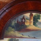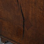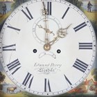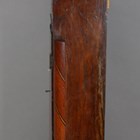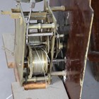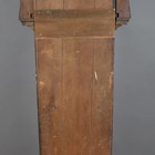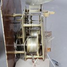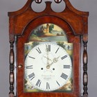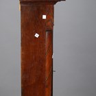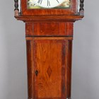 A 19th century oak and mahogany crossbanded longcase clock with eight day movement striking on a bell, the 13-inch painted breakarch dial with black Roman hour numerals, subsidiary seconds and date aperture, the hood with swan neck pediment, glazed door and turned columns, the crossbanded trunk door above a plain base and bracket feet, height 217cm (glass broken), with pendulum and two weights.