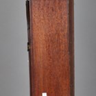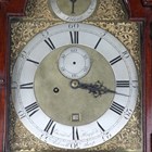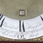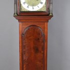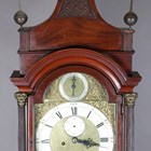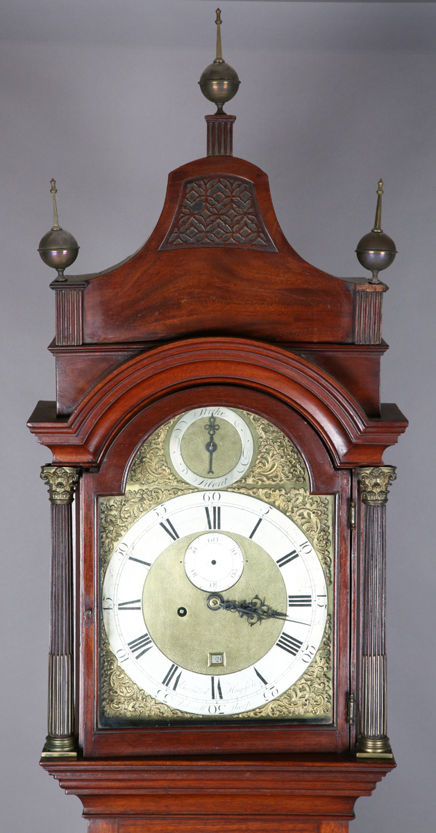 A George III mahogany longcase clock with eight day movement striking on a bell, the 12-inch brass breakarch dial with silvered chime/silent indicator to the arch, above a silvered chapter ring with Roman hour numerals and outer Arabic minutes, signed 'Barnard Huggin Ashwellthorp', framing a matt centre with silvered subsidiary seconds, the pagoda top hood with three brass ball and spire finials above a moulded arch pediment, glazed door and Corinthian columns, the trunk with crossbanded arched door above a similarly crossbanded base and bracket feet, height 262cm, with pendulum and two brass cased weights. Note: Barnard Huggin (1733-1819) is a recorded Norfolk clockmaker working in Ashwellthorpe.