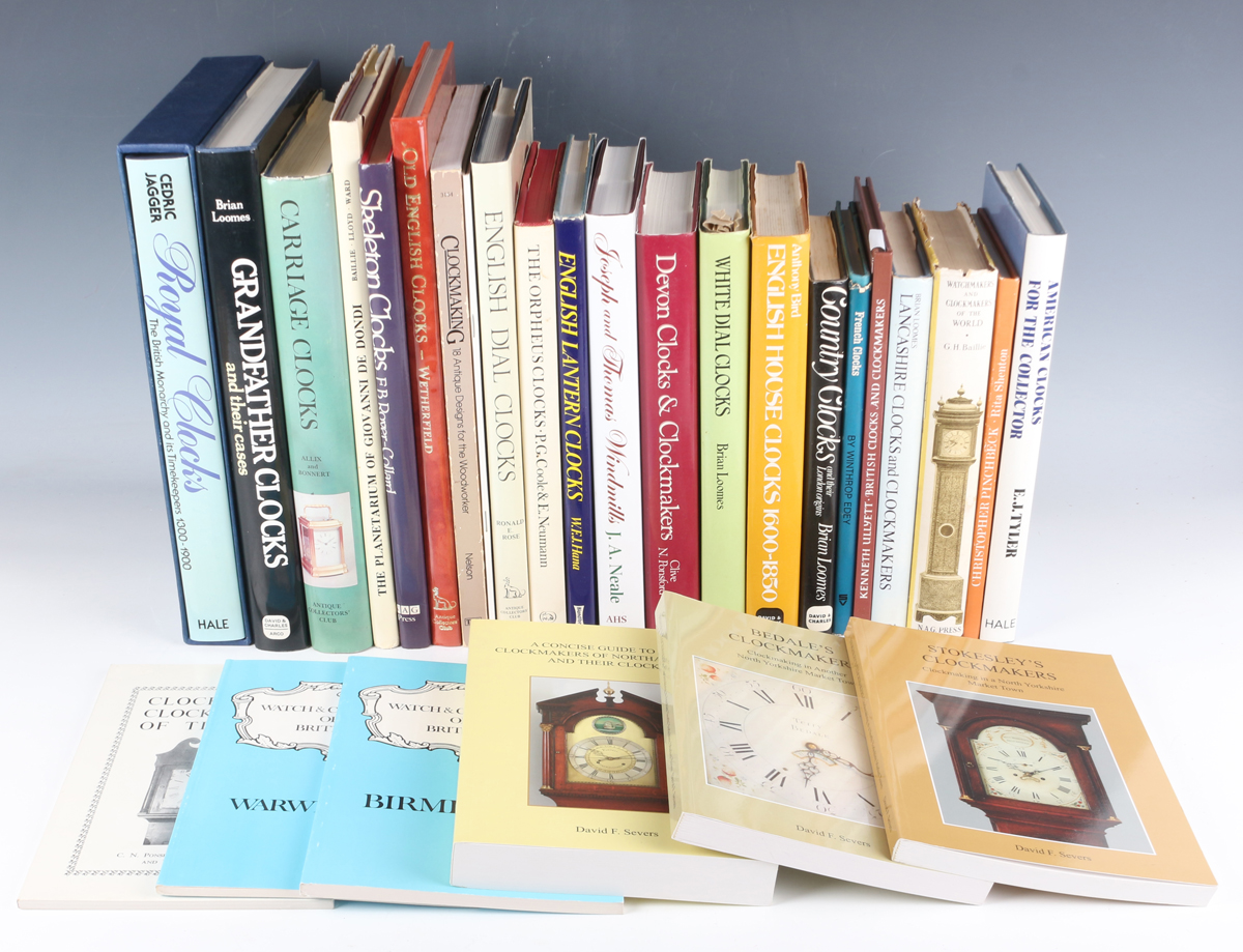 A collection of clock reference books, including 'Joseph and Thomas Windmills' by J.A. Neale, 'English Dial Clocks' by Ronald E. Rose, 'White Dial Clocks' by Brian Loomes, 'Devon Clocks and Clockmakers' by Clive N. Ponsford and other guides to provincial clockmakers.