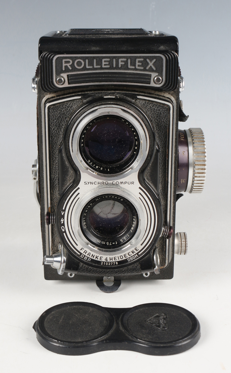 A Franke & Heidecke Rolleiflex twin lens reflex camera, serial number 2102778, with Heidosmat 1:2.8/75 and Tessar 1:3.5 f=75mm lenses.
