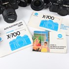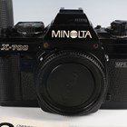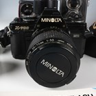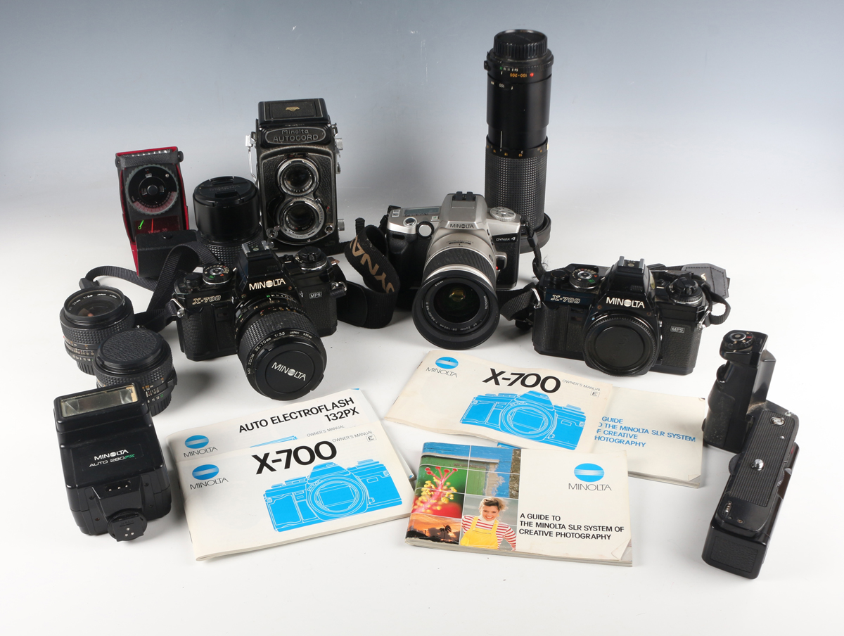A collection of Minolta cameras and lenses, including an Autocord twin lens reflex camera with Rokkor 1:3.2 f=75mm and 1:3.5 f=75mm lenses, an X-700 camera with 35-70mm 1:3.5 zoom lens, an X-700 camera body, a Dynax 4 camera with 28-100mm zoom lens, a 100-200mm 1:5.6 zoom lens, a 135mm 1:2.8 lens, a 50mm 1:1.7 lens, a 28mm 1:3.5 lens and a small group of accessories.