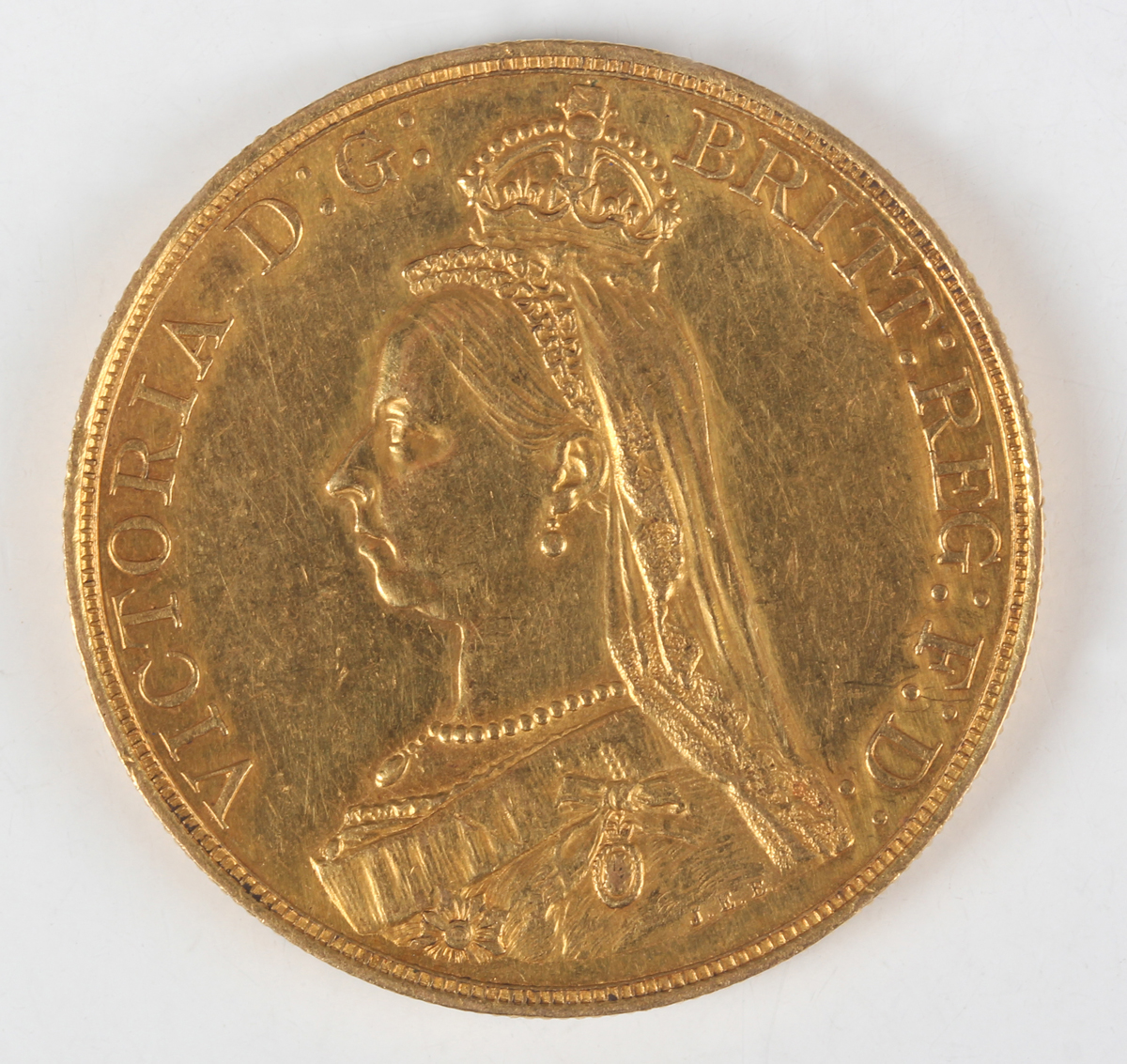 A Victoria Jubilee Head gold five pounds 1887 (good-very fine).