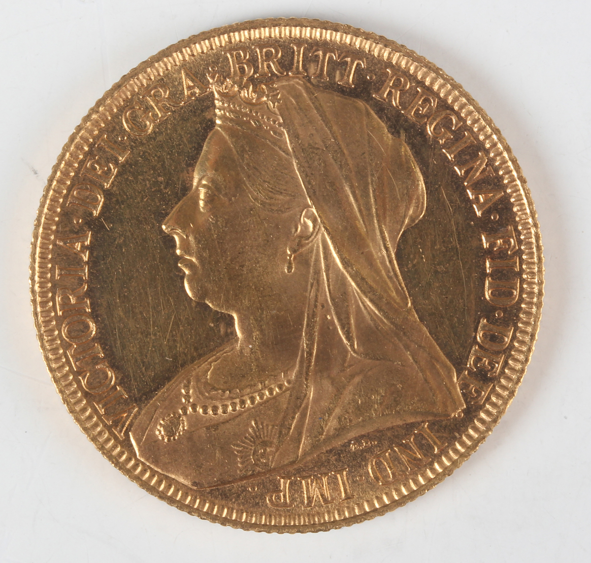 A Victoria Veiled Head gold two pounds 1893 (good-very fine, some light handling evident).