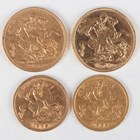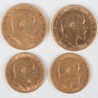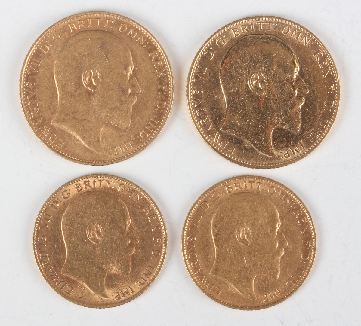 Two Edward VII sovereigns, 1906 and 1907, and two Edward VII half-sovereigns, 1905 and 1906.