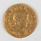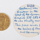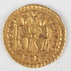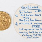 A Roman Empire Gratian gold solidus 374-375 AD, Trier Mint, obverse with diademed, draped and cuirassed bust of Gratian facing right, reverse with two enthroned emperors facing, holding globe between them, 'TROBT' below, Sears 4026, weight 4.0g, with an old collector's ticket describing it as coming from the borders of France and Germany.