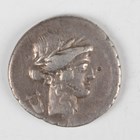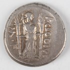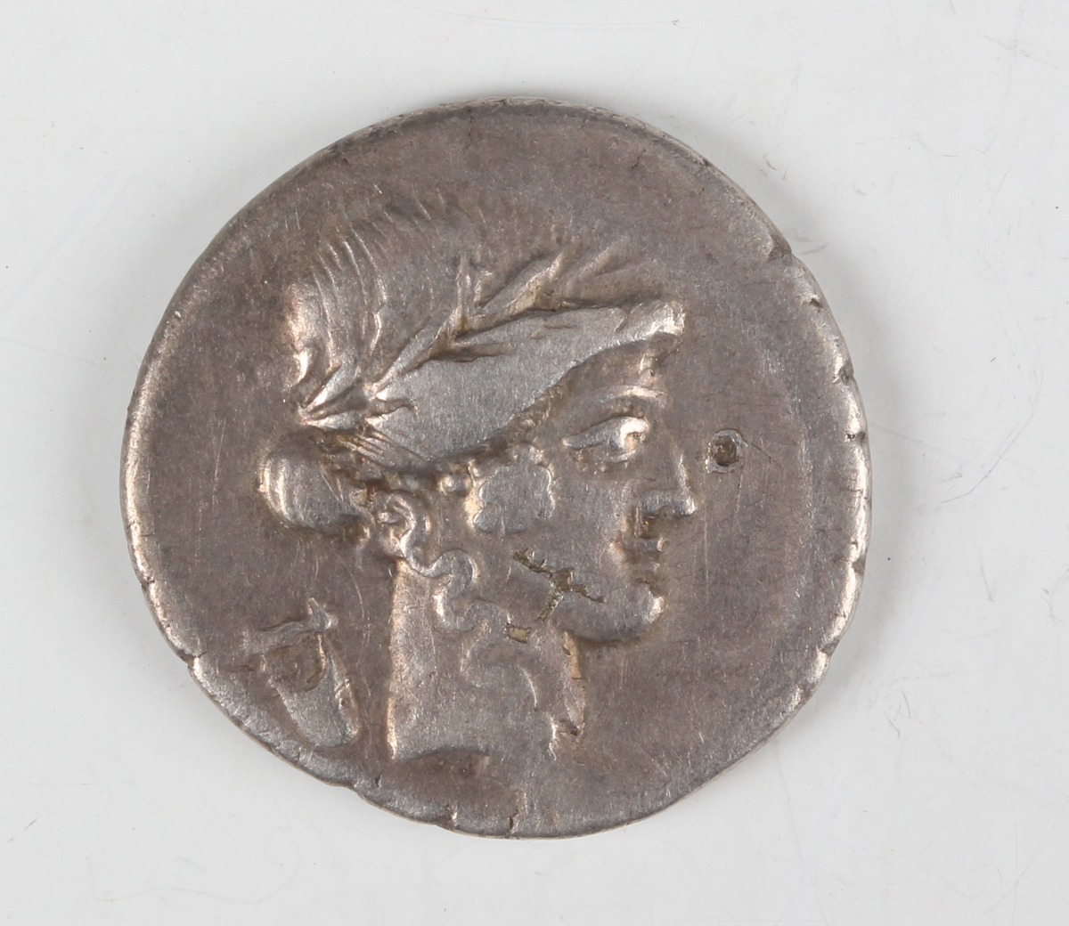 A Roman Republic silver denarius, issued by moneyer P. Clodius M.f. circa 42 BC, obverse with laureate head of Apollo facing right, lyre behind, reverse with Diana standing right holding two long torches, weight 4.1g (good-very fine, banker's test marks to face and field).