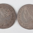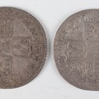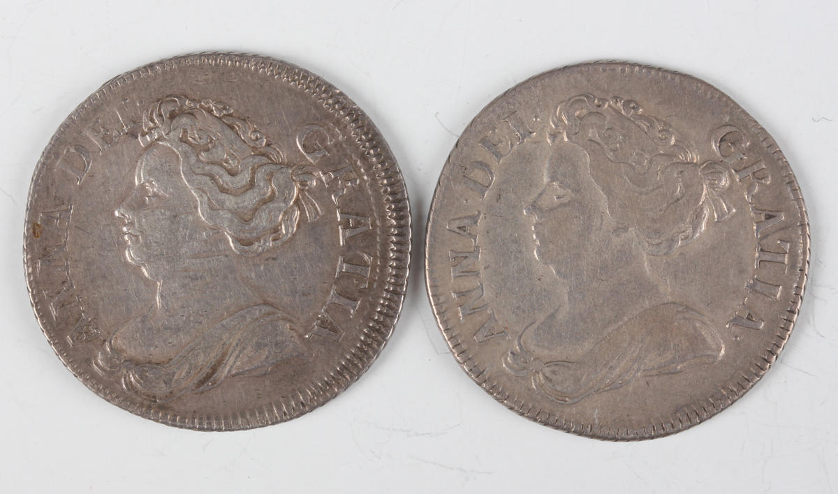 An Anne shilling 1714, fourth bust, roses and plumes, Sp 3617 (good-very fine, cleaned in the past, now toning), together with an Anne shilling 1711, fourth bust, plain angles, Sp 3617 (some adjustment marks, off-centre but good-very fine, toned).