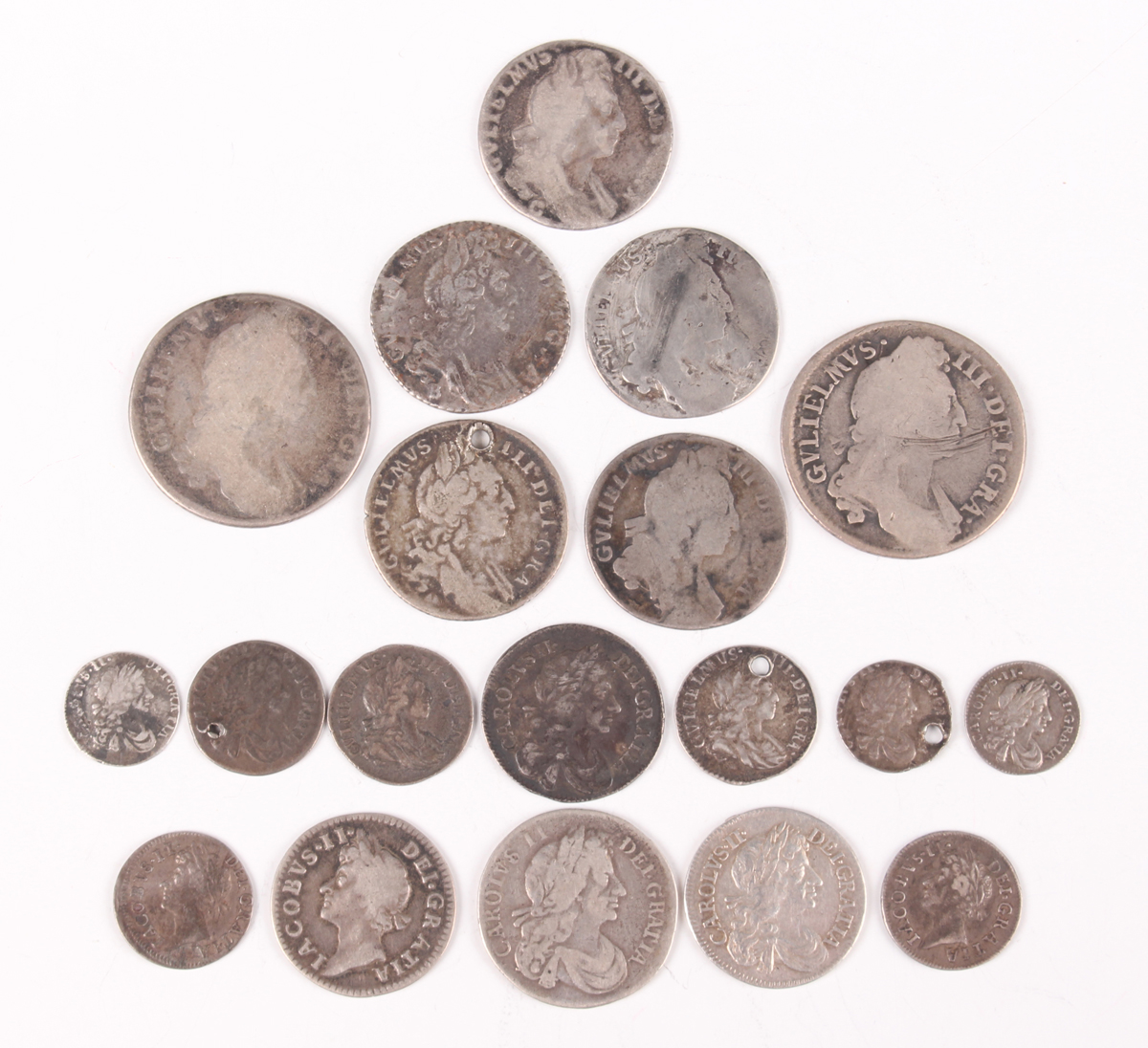 A collection of late 17th century silver coinage, including a Charles II sixpence 1683, a Charles II fourpence 1672 and a James II fourpence 1686.