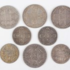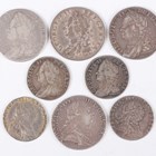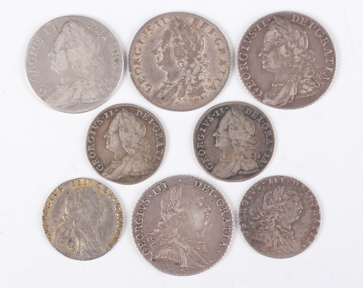 A small collection of George II and George III silver coinage, including a George II shilling 1745, roses in angles, a George II shilling 1758, a George II sixpence 1758 and a George III shilling 1787 with semée of hearts.