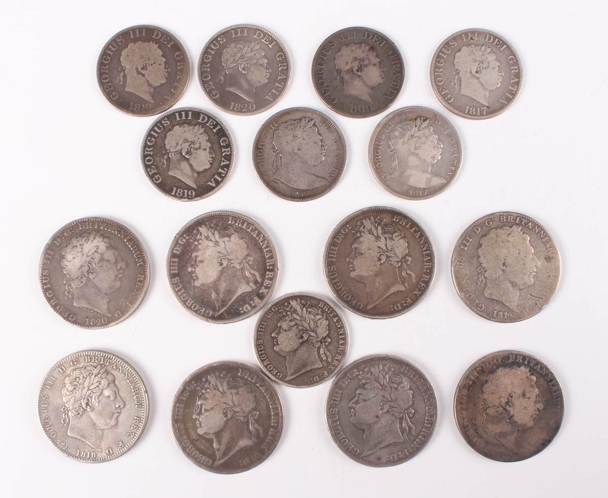 A collection of George III and George IV silver coinage, including crowns and half-crowns (good-fine throughout).