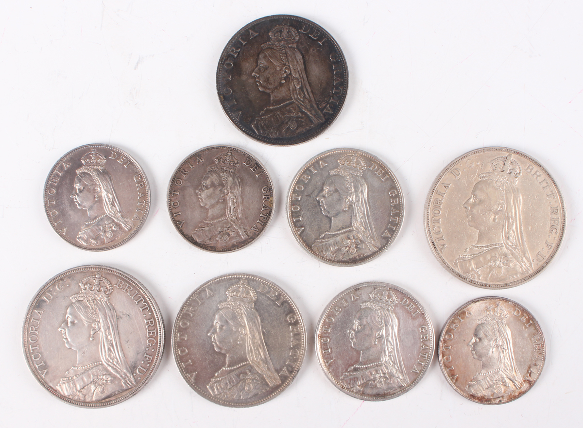 A collection of Victoria Jubilee Head silver coinage, including a crown 1887, a double-florin 1887, a half-crown 1888 and a florin 1887 (good-very fine throughout, mixed toning, evidence of some cleaning throughout).