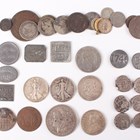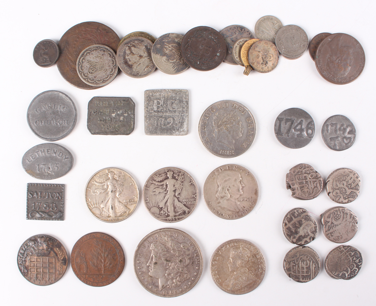 A collection of 18th, 19th and 20th century European and world coins, tokens and paranumismatic items, including a small group of India one rupees, a USA Morgan dollar 1904, three USA half-dollars, 1942, 1944 and 1954, a contemporary forgery of a George III half-crown, dated 1818, and a small group of communion tokens.