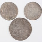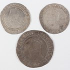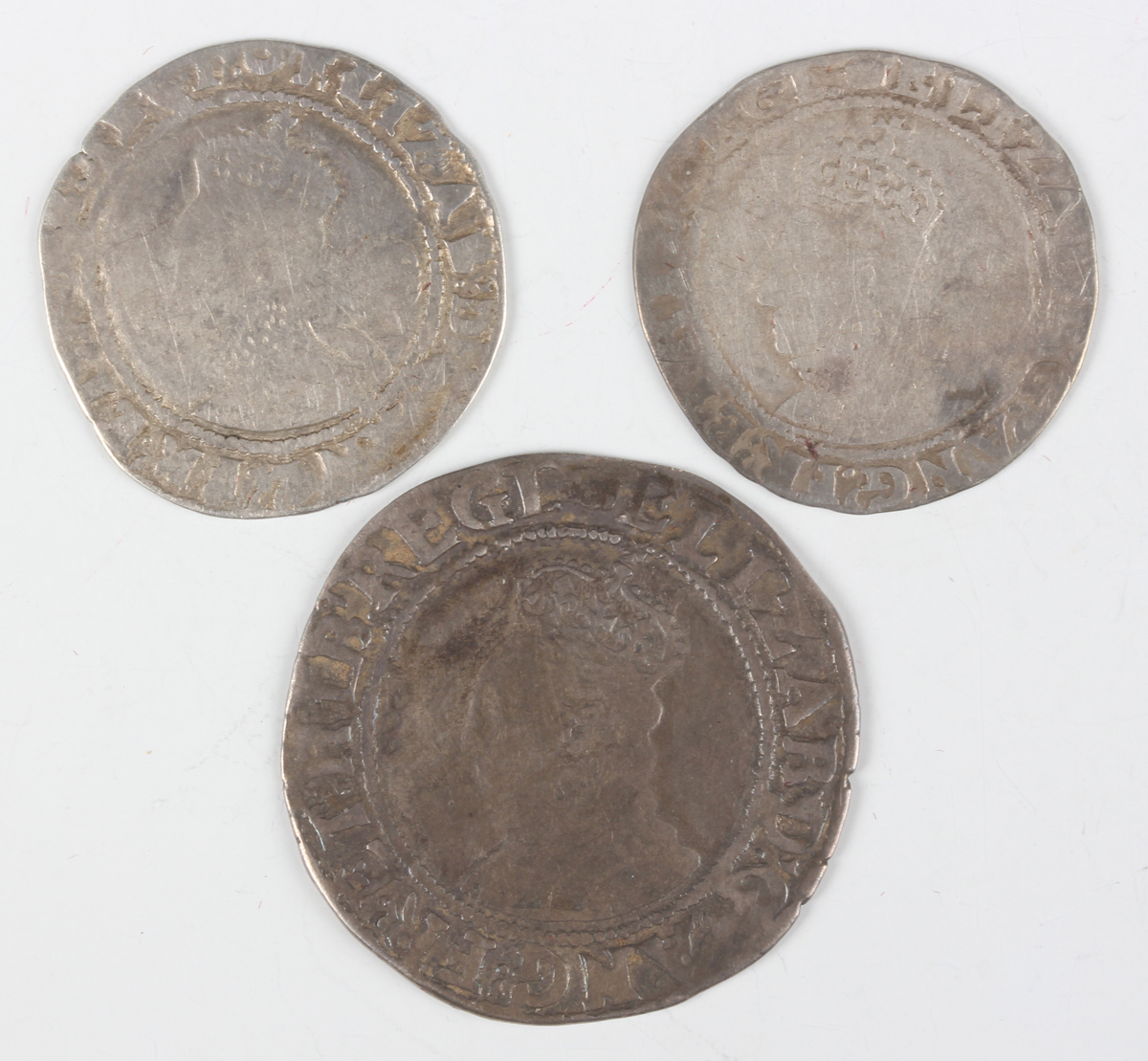 A group of three Elizabeth I hammered silver coins 1558-1603, including a shilling, sixth issue, mintmark tun, and a sixpence, sixth issue, mintmark crescent.
