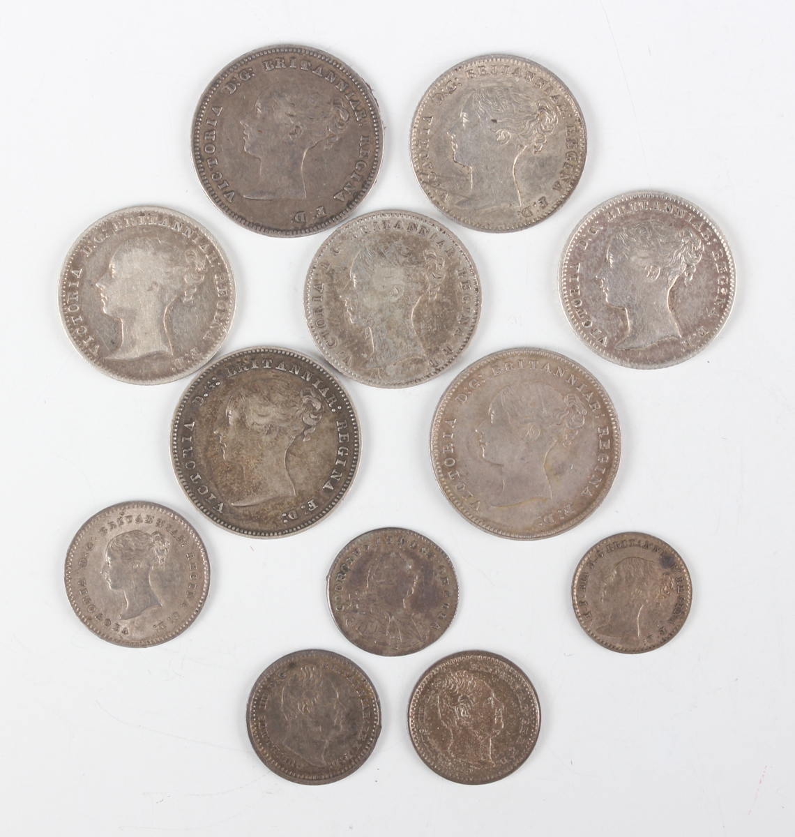 A small collection of late 18th and 19th century silver Maundy and other fractional coinage, including a twopence 1838, a penny 1842 and a fourpence 1885, together with four Victoria Young Head groats, including 1838, and two William IV colonial issue one-and-a-half-pences 1834 (generally good-very fine throughout, some lustre).