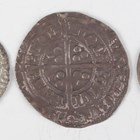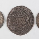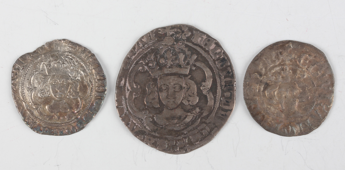 A group of three medieval hammered silver coins, comprising an Edward I penny, Canterbury Mint, a Henry VII groat, mintmark pansy, London Mint, and a Henry VII half-groat, Canterbury Mint.