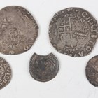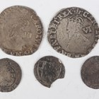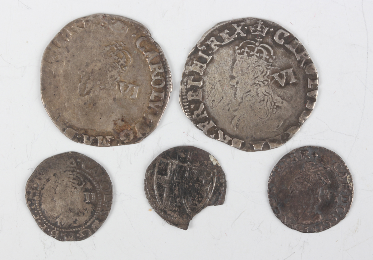 A small group of Charles I and later hammered coinage, including two Charles I sixpences, one mintmark crown, the other mintmark tun, a Commonwealth penny (damaged) and a Scotland Charles I twenty pence.