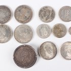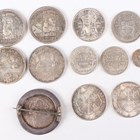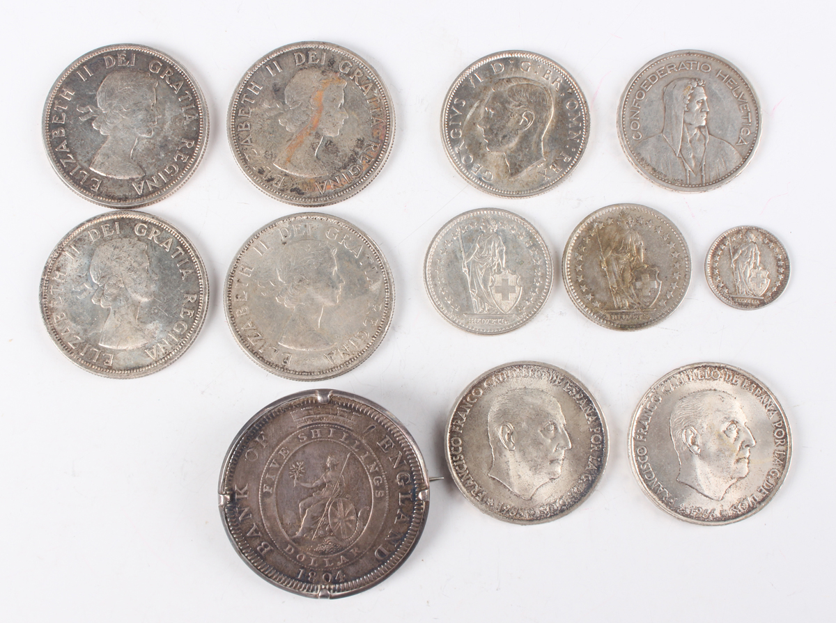 A small collection of European and world silver coinage, including four Canada dollars, comprising two 1958, 1961 and 1962, two Spain one hundred pesetas, both 1966, and a George III dollar 1804, mounted as a brooch.