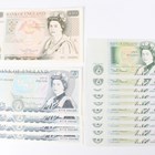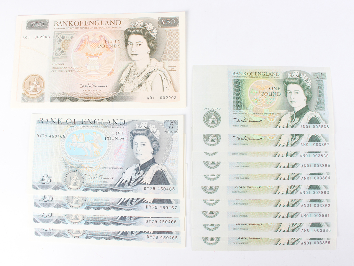 A collection of Elizabeth II banknotes, all Chief Cashier D.H.F. Somerset, comprising a Bank of England fifty pounds note, serial number A01 002203, a consecutive run of four Bank of England five pounds notes, serial numbers DY79 450465 to DY79 450468, and a consecutive run of ten Bank of England one pound notes, serial numbers AN01 003859 to AN01 003868 (all uncirculated).