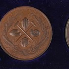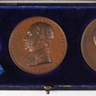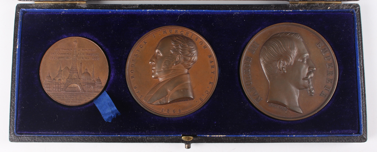 Two rare mid to late 19th century bronze medallions awarded to Robert Etheridge, comprising a medallion presented by the Geological Society of London, dated 1880, obverse with bust of 'Sir Roderick I. Murchison, Bart, KCB, 1886', reverse detailed 'Siluria', the centre with crossed geological hammers and an arrangement of fossil specimens to quarters, diameter 55mm, and a French presentation medallion, dated 1855, obverse with bust of Napoleon III, reverse with French arms within a border of shields, diameter 60mm, with a blue velvet-lined case, fitted for three medallions, together with another bronze medallion, obverse with central depiction of the Eiffel Tower, reverse detailed 'Souvenir de mon Ascension au 1er Etage de la Tour Eiffel 1889'. Note: Robert Etheridge, FRS, FRSE, FGS (1819-1903), was an English geologist and noted early palaeontologist, who wrote a number of works concerning fossils and their stratigraphical context. He later served as Assistant Keeper of the British Museum's geological department.