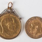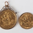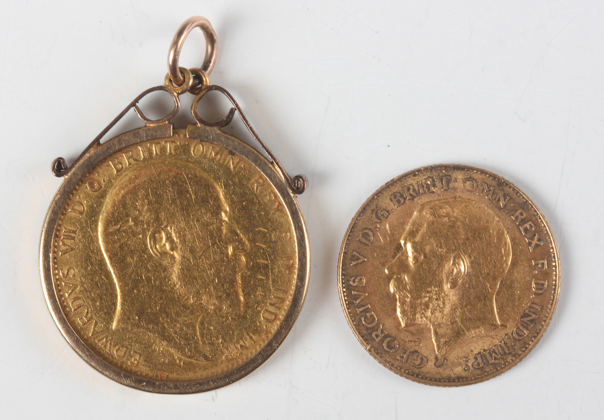 An Edward VII sovereign (damaged edge from old mount), within a 9ct gold cushion mount suspension, together with a George V half-sovereign 1912.