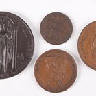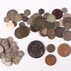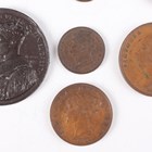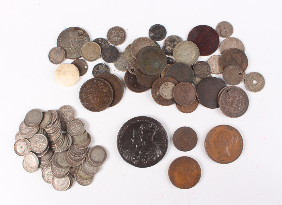A collection of European coins and paranumismatic items, including a group of silver and silver nickel threepences, a Victoria Young Head penny 1855, a Victoria Young Head halfpenny 1853, a George IV farthing 1825 and a George VI and Queen Elizabeth coronation medallion 1937.
