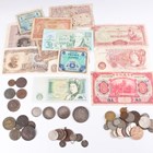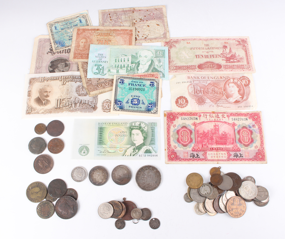 A collection of European and world coins and banknotes, including a China dollar 1914, an East India Company Victoria Young Head one rupee 1840, an India Edward VII one rupee 1908, a USA quarter-dollar 1892 and a China Bank of Communications ten yuan note 1914, Shanghai, serial number S 482765N.