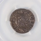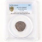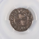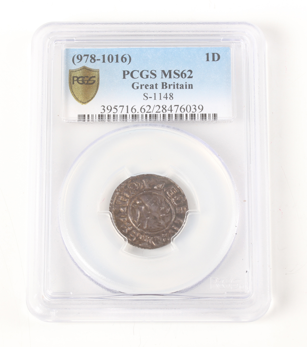 An Aethelred II hammered silver penny 991-997, CRUX type, moneyer 'Aethelgar on Pin', Winchester Mint, Sp 1149, slabbed and graded MS62 by PCGS.