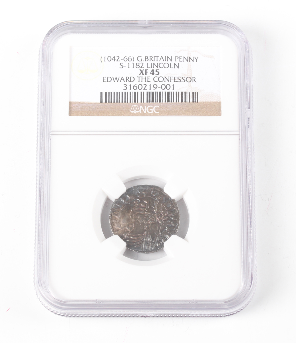 An Edward the Confessor hammered silver penny 1042-1066, hammer cross type, moneyer 'Aelfpine on Ciceit', Chichester Mint, Sp 1182, slabbed and graded XF45 by NGC.