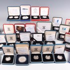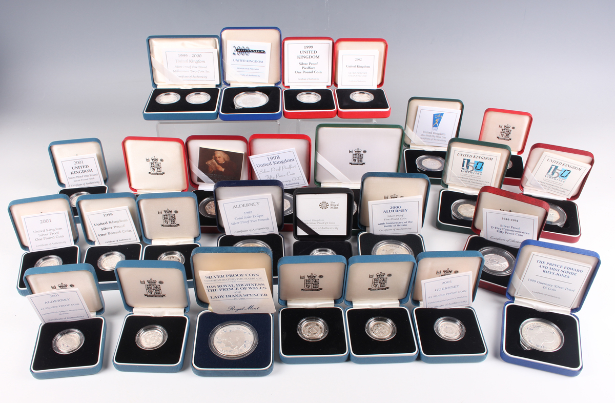 A large collection of Elizabeth II Royal Mint silver proof coins, including a piedfort one pound 1999, a Millennium one pound two-coin set 1999-2000, a piedfort fifty pence 1998 celebrating the 25th Anniversary of the EEC, and a Millennium five pounds 2000, all deluxe-cased (some certificates missing).