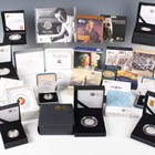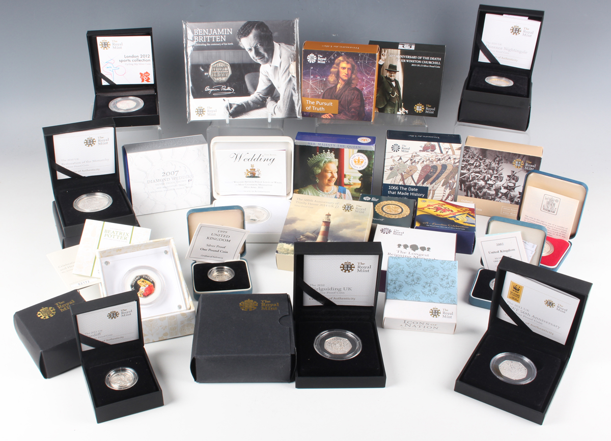 A collection of Elizabeth II Royal Mint Brilliant Uncirculated and proof commemorative coins, including a Sir Isaac Newton silver proof fifty pence 2017, a Prince William and Catherine Middleton Royal Wedding silver five pounds 2011, a Beatrix Potter and her Little Tales Mr Jeremy Fisher silver proof fifty pence 2017 and a 950th Anniversary of the Battle of Hastings silver piedfort fifty pence 2016, the majority deluxe-cased with certificates.