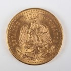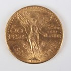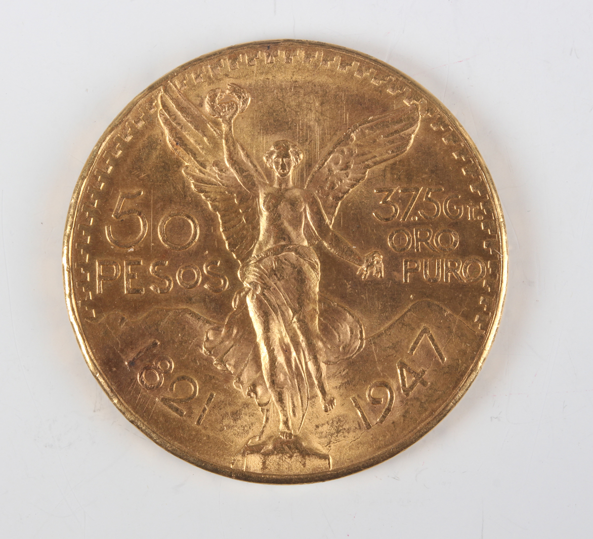 A Mexico gold fifty pesos or 'Centenario', obverse with winged Victory standing, holding laurel wreath, detailed '1821' and '1947' below.