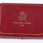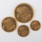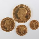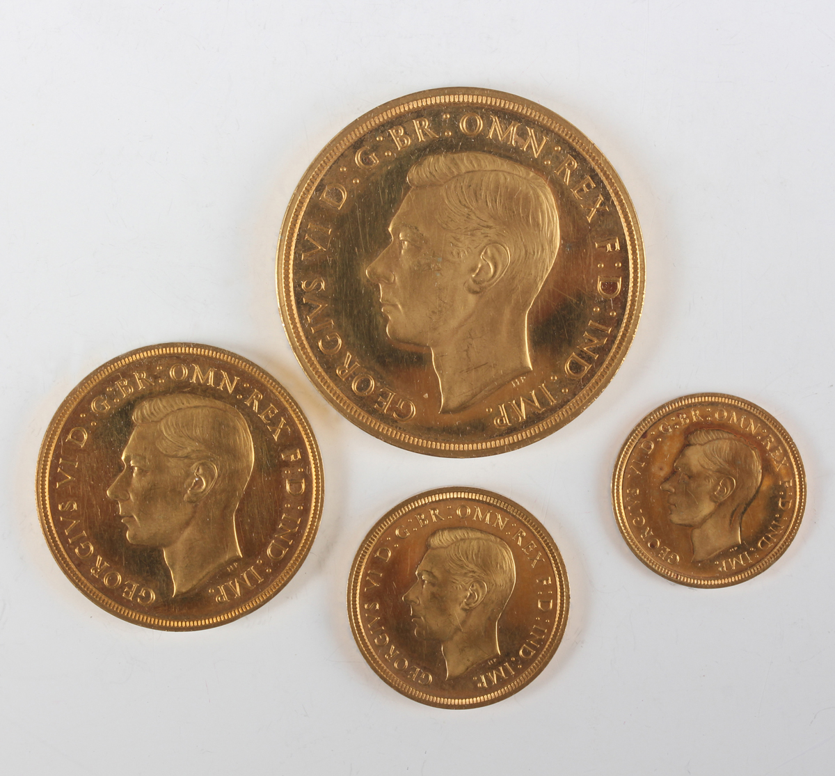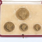 A scarce George VI gold proof four-coin specimen set 1937, comprising five pounds, two pounds, sovereign and half-sovereign, with original gilt-tooled red leather case (some hairlines, some edge marks from poor handling, otherwise extremely fine).