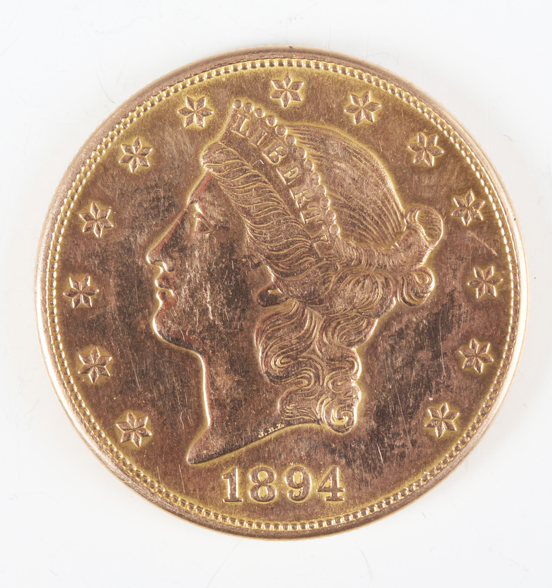 A jeweller's copy of a USA Liberty Head gold twenty dollars 1894 San Francisco Mint (tests at 15ct).
