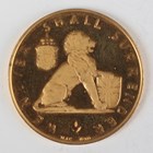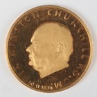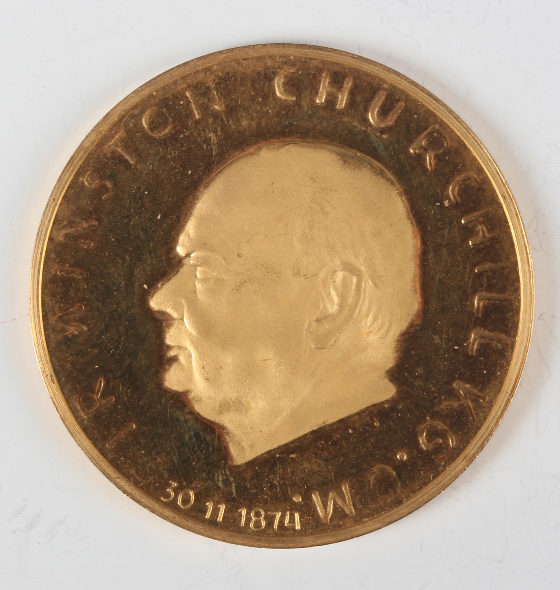 A Sir Winston Churchill gold commemorative medallion, obverse with bust facing left, detailed 'R. Schmidt' below, reverse with lion standing firm, facing right, holding shield, border detailed 'We Never Shall Surrender', diameter 32mm.