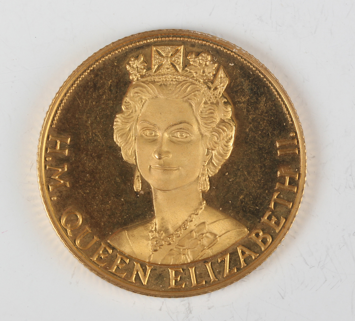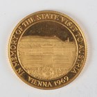 An Elizabeth II gold commemorative medallion, obverse with crowned bust facing slightly left, reverse with view of Vienna, border detailed 'In Memory of the State Visit to Austria, Vienna 1969', diameter 25mm.