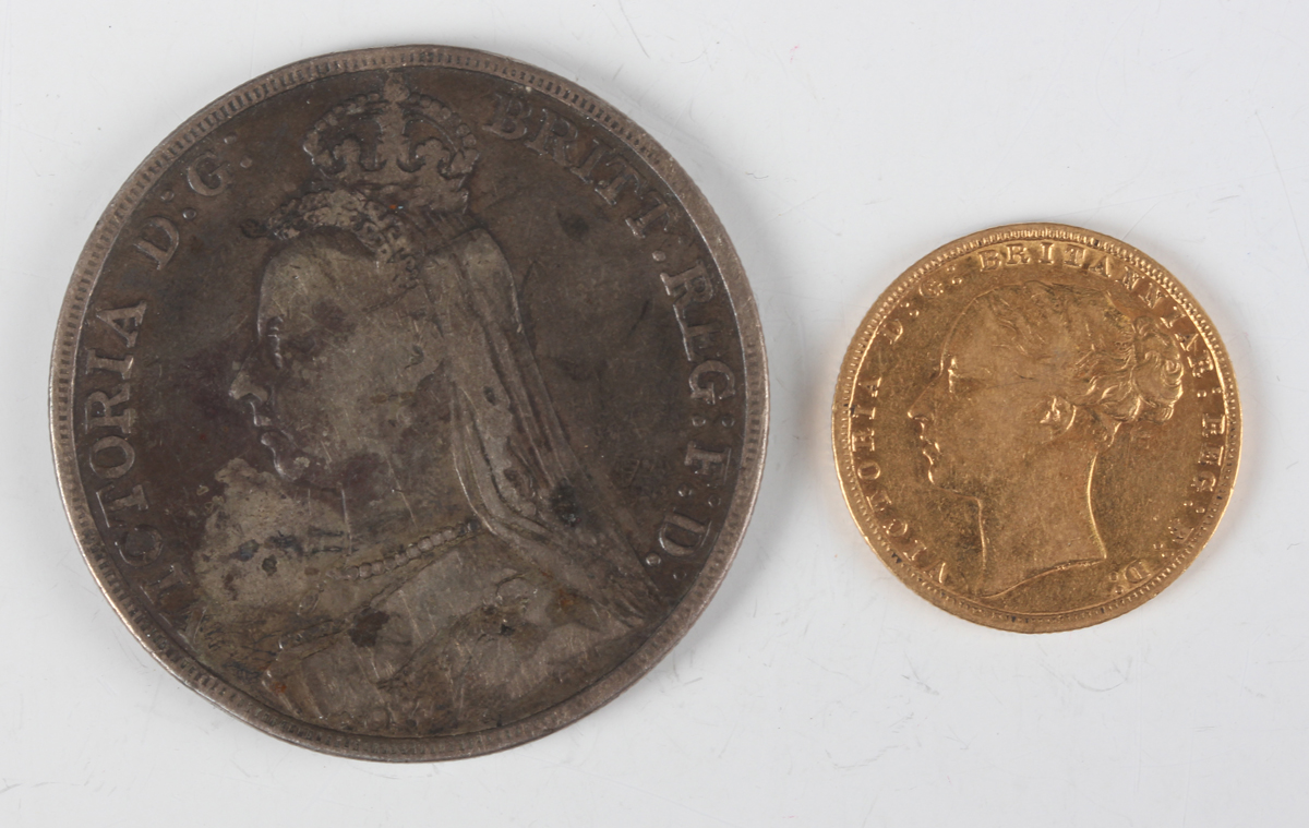 A Victoria Young Head sovereign 1876, together with a Victoria Jubilee Head crown 1892.