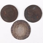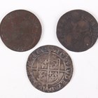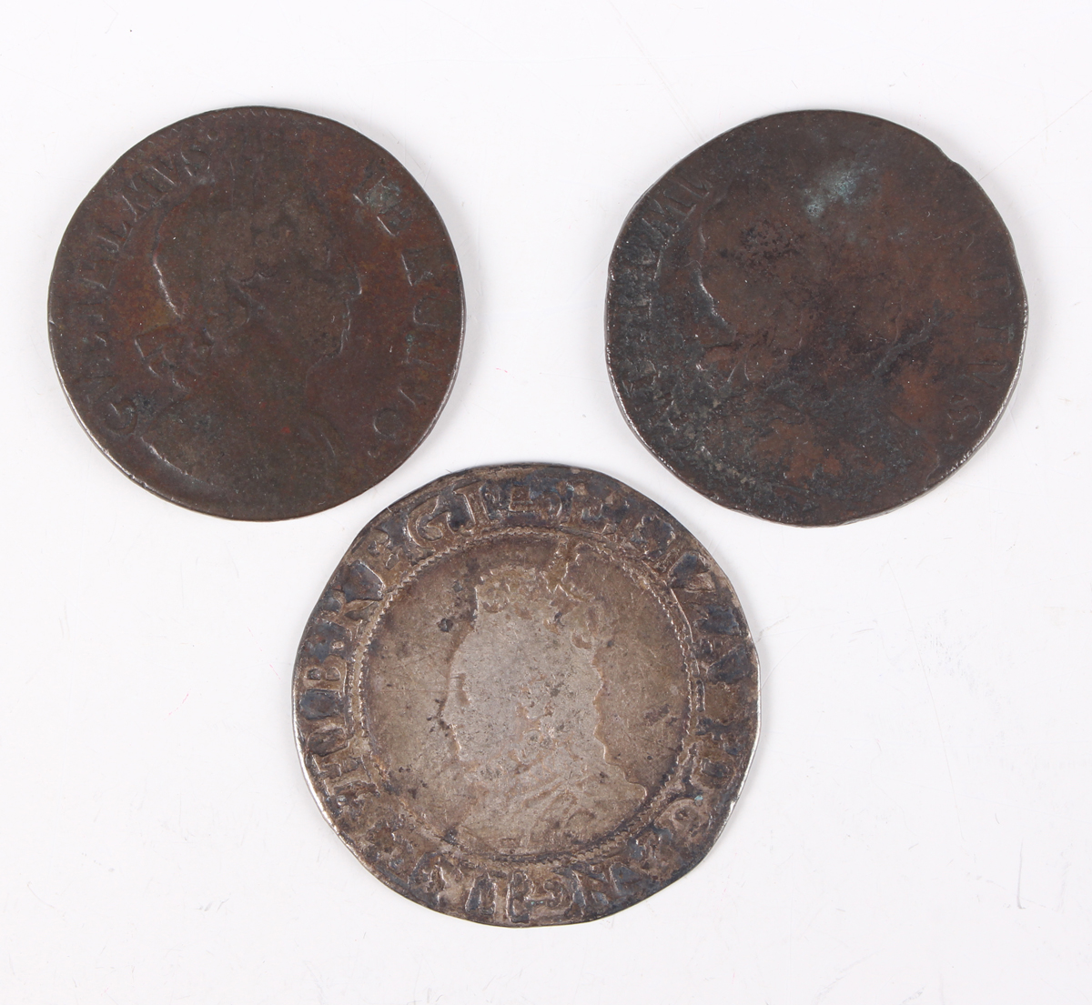 An Elizabeth I hammered silver shilling 1558-1603, sixth issue, mintmark key, together with two William III halfpennies, 1698 and 1700.