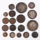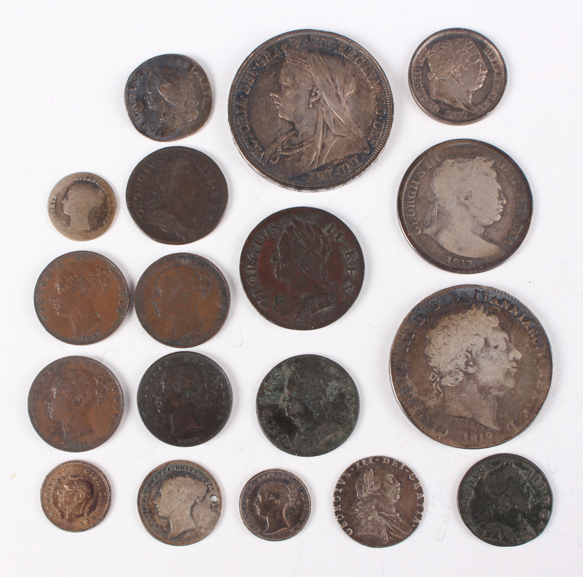 A collection of 18th, 19th and 20th century British silver and copper coinage, including a George III crown 1819, a George III half-crown 1817, a George III shilling 1817 and a Victoria Veiled Head crown 1897, edge detailed 'LXI' with star stop.
