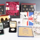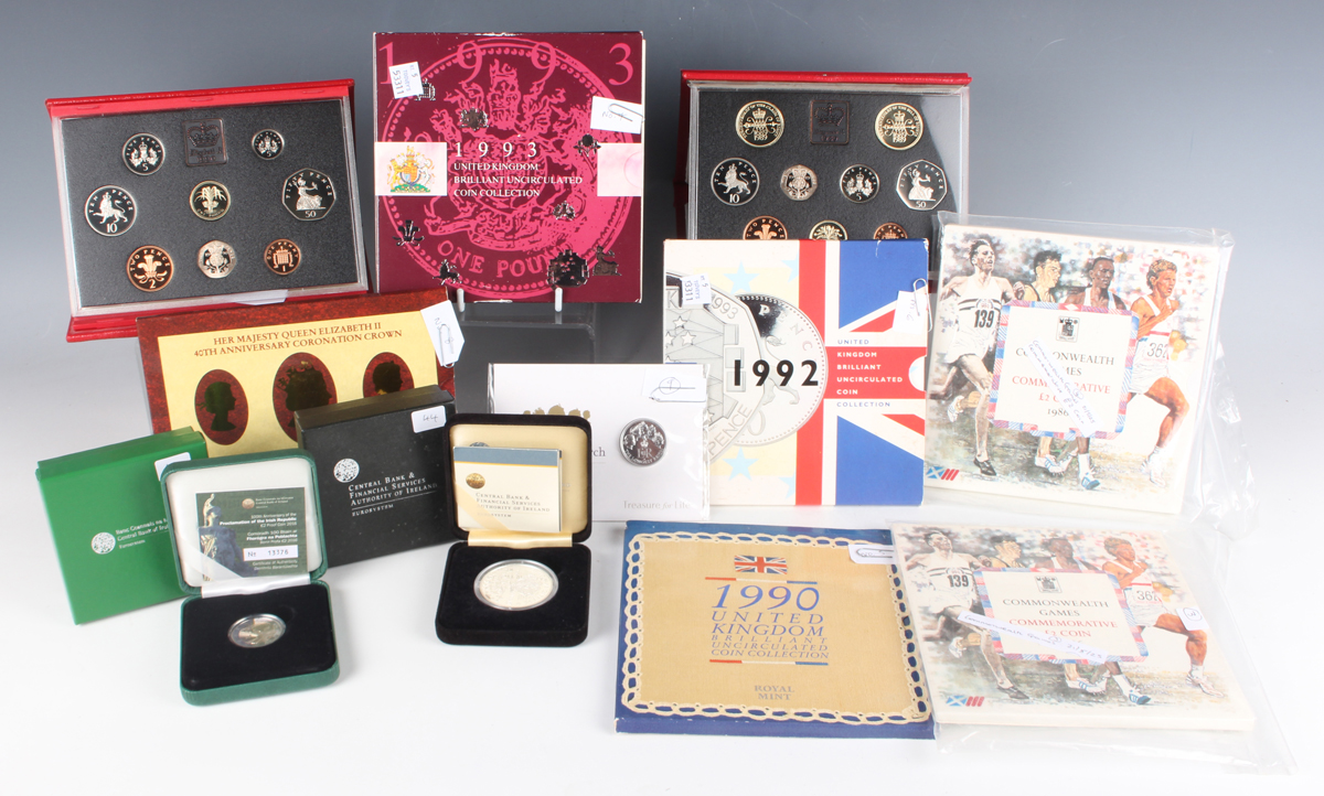 A small collection of Elizabeth II commemorative coinage, including two Royal Mint United Kingdom deluxe year type sets, 1989 and 1990, and a Royal Mint fine silver twenty pounds 2015, within a card display.
