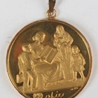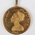 An Iran .900 gold 'Mother's Day' commemorative medal, obverse with Queen Farah Pahlevii with text border, reverse with the queen with open book, surrounded by children, diameter 40mm including cushion frame mount, with an associated presentation case.