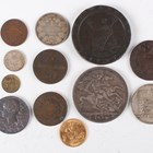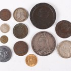 An Edward VII half-sovereign 1907, together with a small group of other coins and medallions, including a George III Cartwheel twopence, a Victoria Jubilee Head crown 1890 and a Victoria Diamond Jubilee medallion, diameter 25mm.