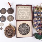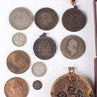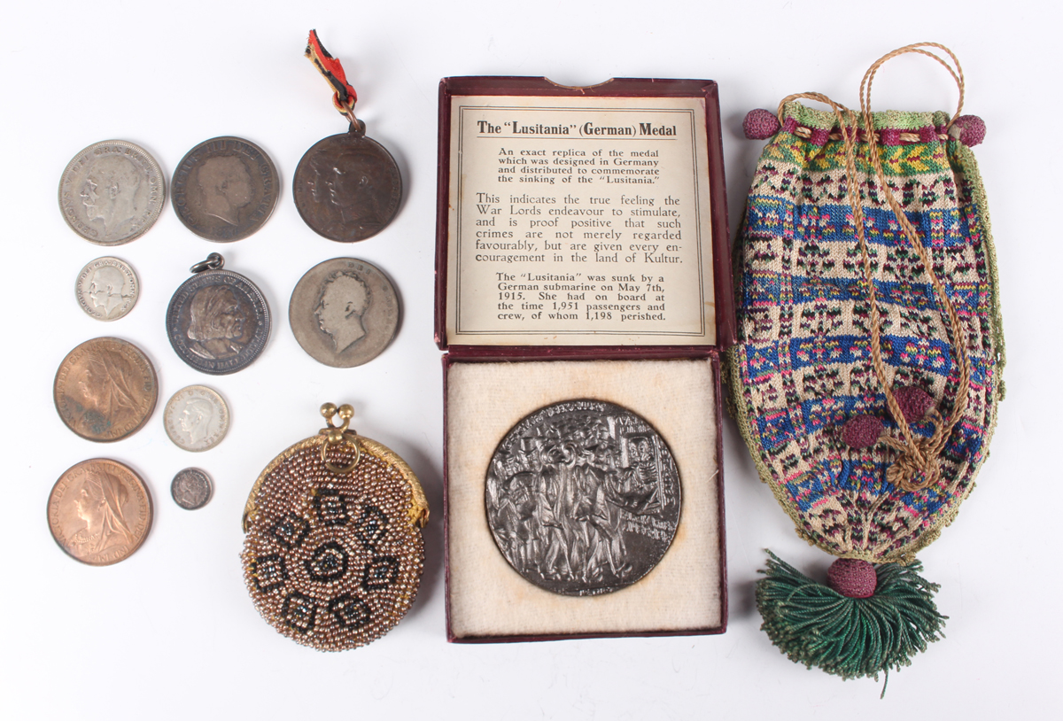 A small group of coins and associated items, including an RMS Lusitania propaganda medallion, boxed, a George III half-crown and a Victoria Veiled Head penny 1897 (uncirculated).