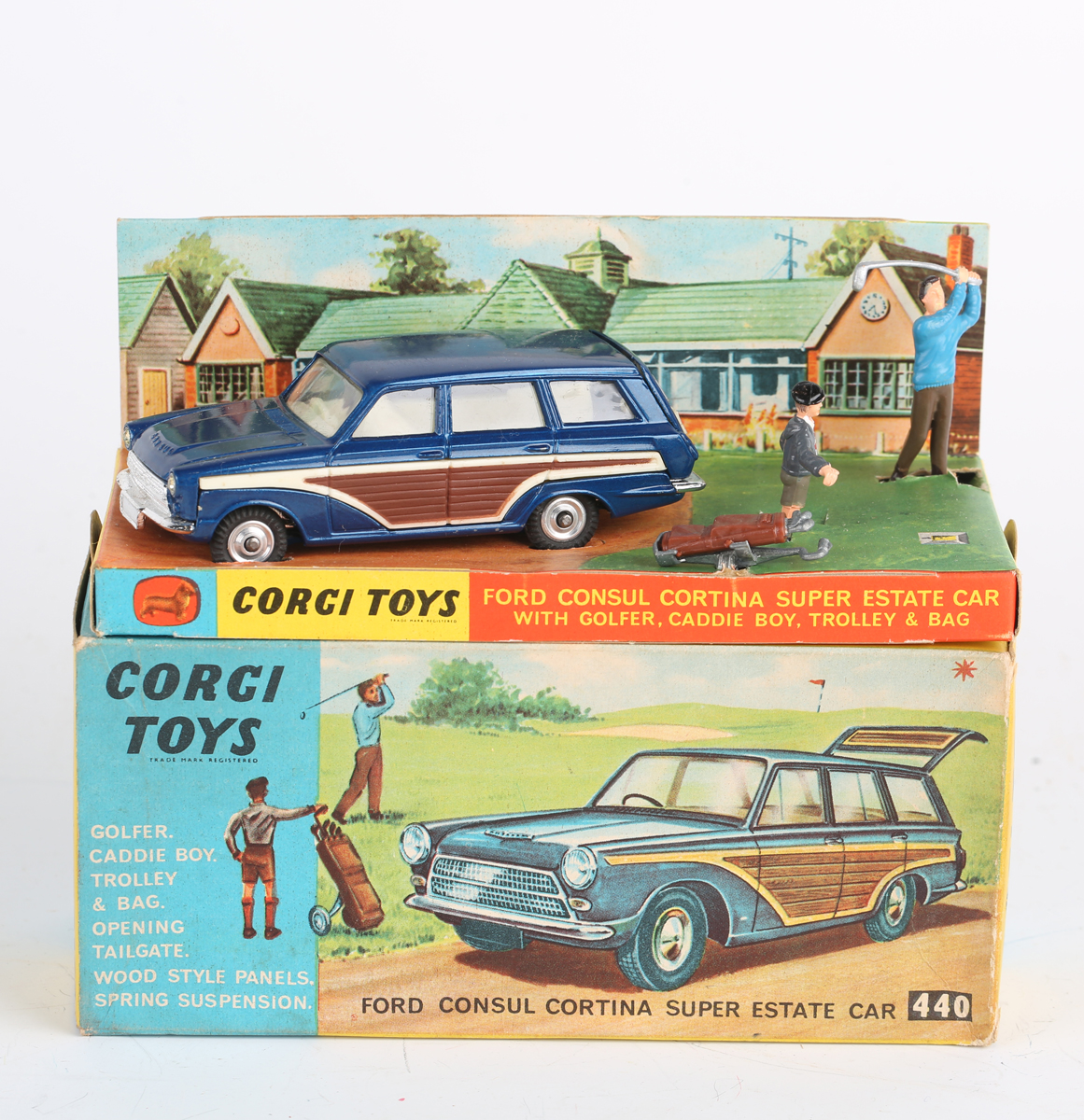 A Corgi Toys No. 440 Ford Consul Cortina Super estate car, boxed with diorama, golfer, caddie boy and golf bag (minor paint chips, box lightly torn and scuffed).