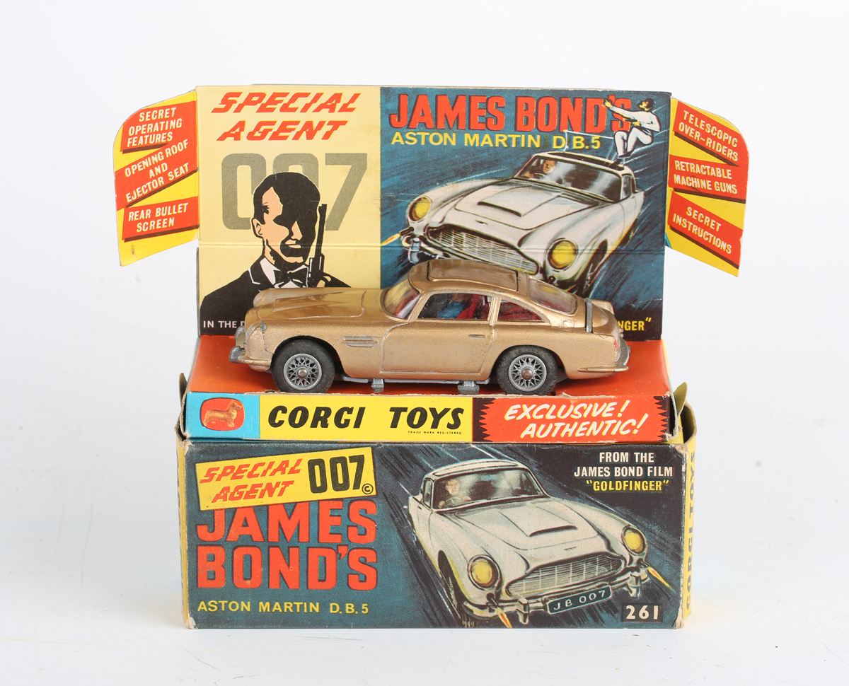A Corgi Toys No. 261 James Bond's Aston Martin DB5, boxed with diorama, two bandit figures, envelope, secret instructions and lapel badge (minor paint chips, diorama and box lightly creased, torn and scuffed).