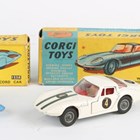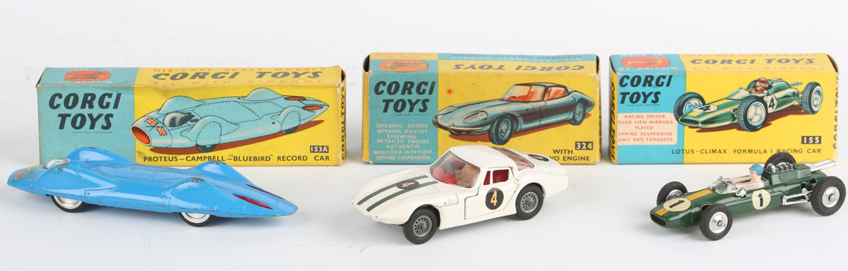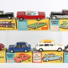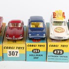 Seven Corgi Toys cars, comprising No. 251 Hillman Imp, No. 307 E Type Jaguar, No. 224 Bentley Continental, No. 246 Chrysler Imperial, No. 475 Citroën Safari Olympic winter sports with skier, skies and sticks, No. 492 Volkswagen European police car and No. 230 Mercedes-Benz 220 SE Coupe, all boxed (some paint chips, Bentley overpainted, boxes creased and scuffed, Chrysler box lacking end flap, some with owner's name).