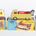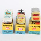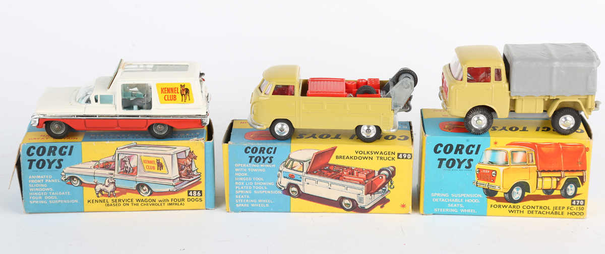 Three Corgi Toys vehicles, comprising No. 486 Kennel Service wagon with four dogs, No. 470 Forward Control Jeep and No. 490 Volkswagen breakdown truck, all boxed (some minor paint chips, kennel box has detached end flap).