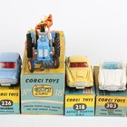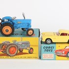 Six Corgi Toys vehicles, comprising Gift Set No. 18 Fordson Power Major tractor with four furrow plough, No. 218 Aston Martin DB4, No. 226 Morris Mini-Minor, No. 238 Jaguar Mark X, No. 303 Mercedes-Benz 300SL Open Roadster, all boxed, and No. 405m Bedford Utilecon Fire Tender (paint chips, boxes creased and scuffed).
