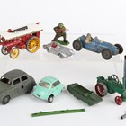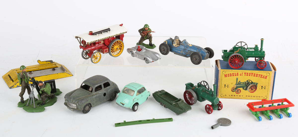 A small group of diecast vehicles and accessories, including two Matchbox Models of Yesteryear Y-1 Allchin traction engines, one boxed, showman’s engine, Chad Valley clockwork Hillman Minx, Tri-ang Spot-On No. 118 BMW Isetta, Crescent Cooper-Bristol and Britains Swoppet plastic soldiers (playwear and paint chips).