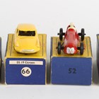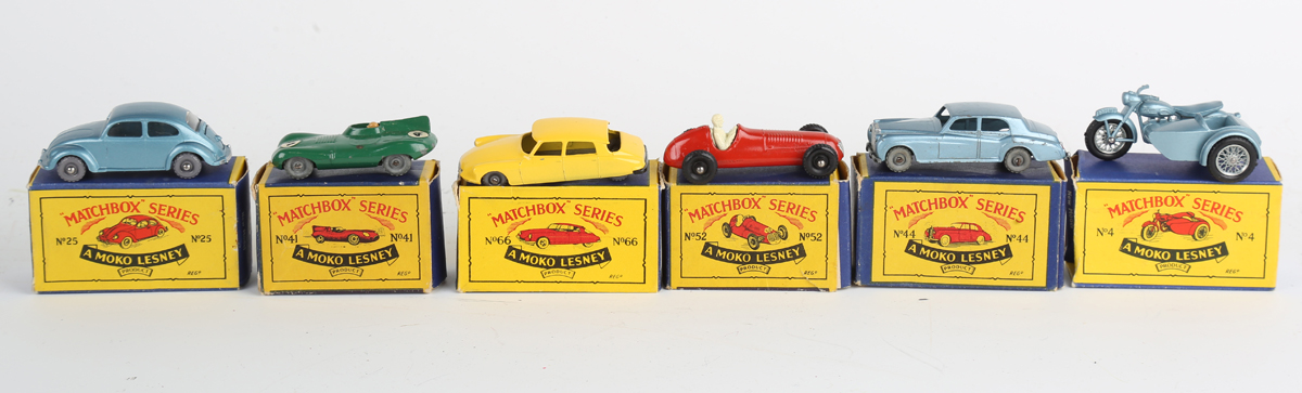 Six Matchbox Series Moko Lesney regular wheel vehicles, comprising No. 4C Triumph T110 motorcycle and side car, No. 25b Volkswagen, No. 41A Jaguar D Type, No. 44A Rolls-Royce Silver Cloud, No. 52A Maserati 4 CLT and No. 66A Citroën DS19, all boxed (No. 41A Jaguar has paint chips, boxes lightly creased, torn and scuffed).