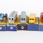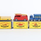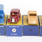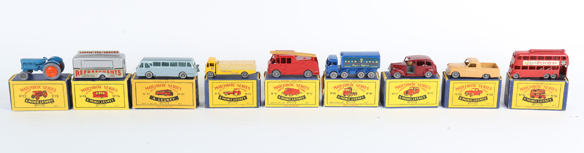 Eight Matchbox Series Moko Lesney regular wheels vehicles, comprising No. 9C Merryweather Marquis fire engine, No. 10C Foden 8-wheel sugar container, No. 17c Austin Taxi, No. 50A Commer pick-up, No. 51A Albion Chieftain 'Portland Cement', No. 56A London trolley bus, No. 72A Fordson Major tractor and No. 74A mobile canteen, together with a Matchbox Series Lesney No. 40 Leyland Tiger Coach, all boxed (some minor paint chips, boxes lightly creased and scuffed, No. 10C box also torn).